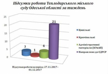 Так за період з 28 листопада  по 01 грудня 2017 року Теплодарським міським судом Одеської області розглянуто: