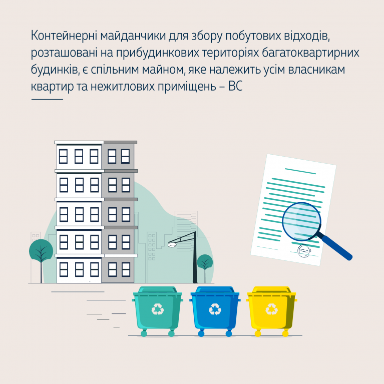 КГС ВС погодився з висновком місцевого господарського суду, що контейнерні майданчики для твердих побутових відходів, які розташовані на прибудинкових територіях житлових будинків, є спільною сумісною власністю мешканців будинку. Особливість правового статусу цих споруд – те, що вони є спільною сумісною власністю власників квартир у багатоквартирному будинку відповідно до прямої норми закону і підтвердження права власності на зазначені споруди не потребує здійснення співвласниками будь-яких додаткових дій, що виключає набуття будь-якою іншою особою права власності на такі споруди.