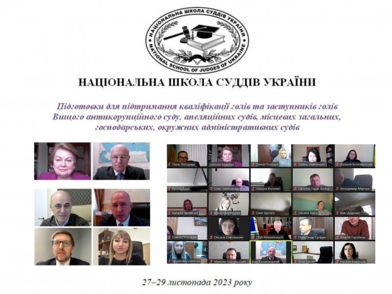 27–29 листопада 2023 року Національна школа суддів України проводить підготовку голів і заступників голів Вищого антикорупційного суду та Апеляційної палати Вищого антикорупційного суду, апеляційних судів, місцевих загальних, господарських, адміністративних судів.