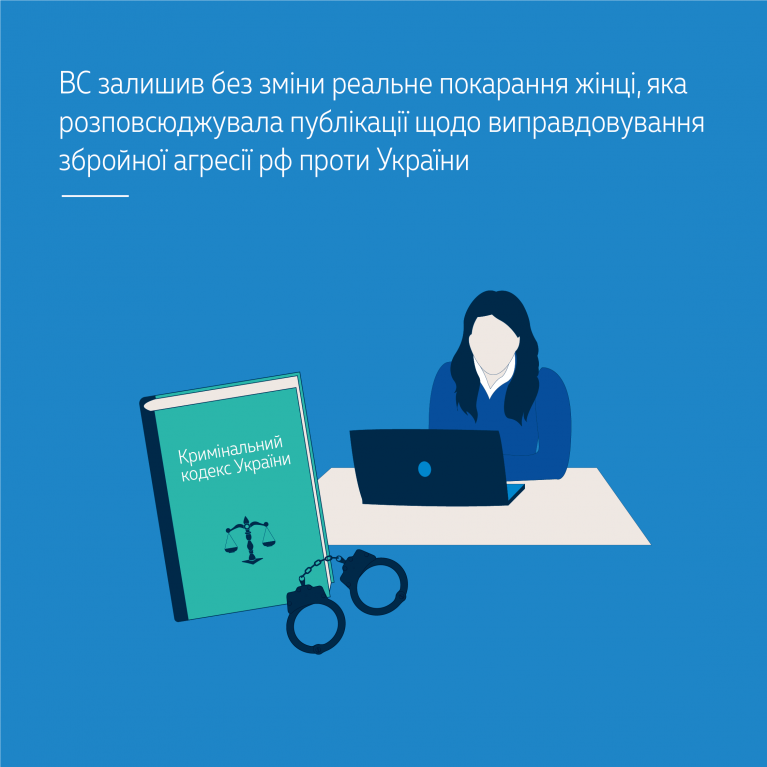 На переконання колегії суддів касаційного суду, особа не могла не усвідомлювати тих подій, які відбувалися в Україні, зокрема, з початком 24 лютого 2022 року повномасштабної збройної агресії рф проти України та українського народу в цілому, коли ЗМІ, соціальні мережі й мобільні месенджери були переповнені інформацією щодо численних злочинів країни-терориста, тотального насильства, масових вбивств та руйнувань, які засуджував і засуджує увесь цивілізований світ. Не проявляючи жодних сентиментів, емпатії та співчуття через масову загибель як військовослужбовців, що стали на захист своєї Батьківщини, так і мирного населення, жінка розповсюджувала публікації, зміст яких всіляко виправдовував збройну агресію росії, метою якої є намагання знищити Україну як державу, та прославляв осіб, які її здійснювали.